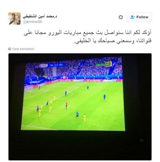 وقال مدير القسم الرياضي في قنوات الموريتانية محمد أمين الشنقيطي في تغريدة على حسابه بموقع التويتر:” أؤكد لكم أننا سنواصل بث جميع مباريات اليورو مجاناً على قنواتنا”، مضيفا في تغريدة أخرى “للعلم لم نتعد على أحد، الحقوق تم شرائها بصفة رسمية من قنوات فرنسية” ، مشيرا إلى أن هدفه يتمثل في “توفير الرياضة للشباب العربي من كل الفئات” .